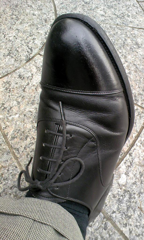▼日々の営業活動で傷や埃にやられていた、礼装にもいける黒のストレートチップが、お姉さんの優しい手解きにより見る見るうちに蘇ってきた。